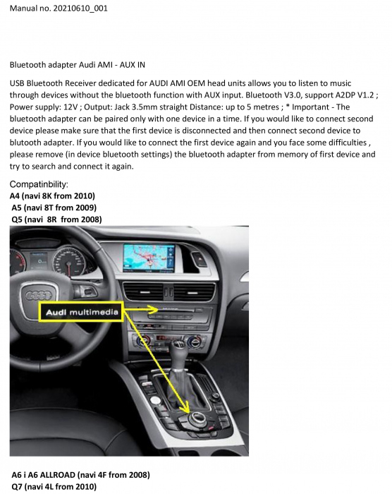 USB Bluetooth Receiver dedicated for AUDI AMI OEM head units allows you to listen to music