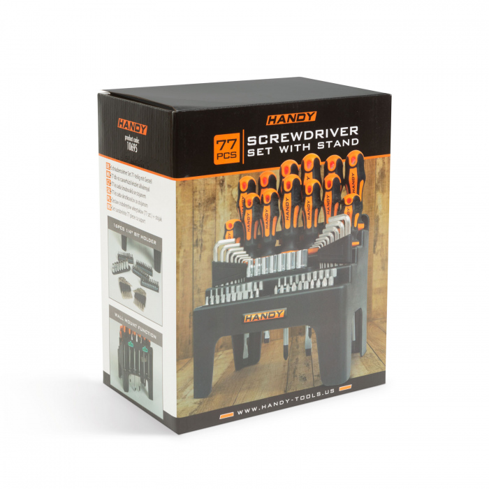 Un set mare de surubelnite pentru a satisface nevoile la aproape orice proces de montaj. Setul include 12 surubelnite, 40 de capete bit, 6 chei tubulare, 16 chei negative hexagonale si un suport pentru depozitarea vizibila a uneltelor. Datorita dimensiunii compacte a consolei, aceasta nu ocupa mult spatiu pe masa garajului sau a atelierului dvs. Poate fi fixata si pe perete cu ajutorul celor doua gauri de suspendare.