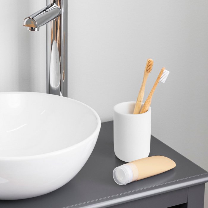 Daca sunteti în cautarea unei elegante curate si a unui design modern, atunci aceasta ceasca de baie alb mat poate fi alegerea perfecta. Suprafata alba mata ofera interiorului baii o nota moderna si eleganta. Cupa din rasina te va incanta nu doar prin aspectul sau, ci si prin durabilitatea si caracterul practic. Materialul este usor de curatat. Cana de dimensiuni compacte se potriveste cu usurinta în jurul chiuvetei sau pe raftul de baie, astfel încât este întotdeauna la îndemâna când aveti nevoie de ea. Fie ca este vorba despre o periuta de dinti, pasta de dinti sau alte obiecte mici, poti depozita totul elegant si îngrijit în aceasta cana de baie.