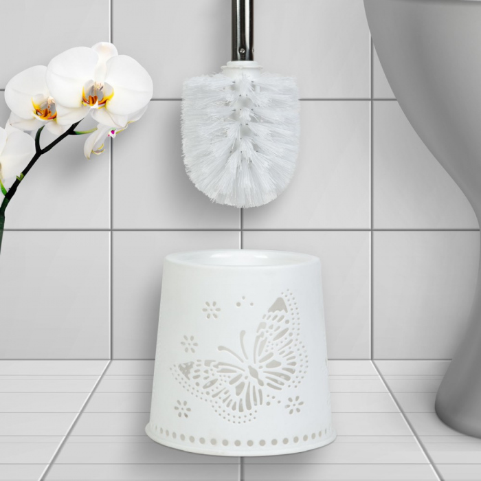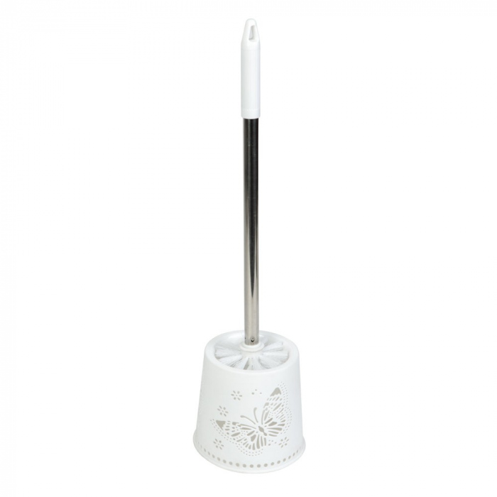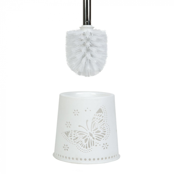 Set practic perie de toaleta + suport alb mat, decorat cu un fluture in lateral. Suportul ofera stabilitate si durabilitate periei. Peria are un mâner argintiu stralucitor care este usor de utilizat si ofera o prindere confortabila. Peria de toaleta ajuta eficient la mentinerea igienei, în timp ce suportul asigura depozitarea în siguranta a periei.