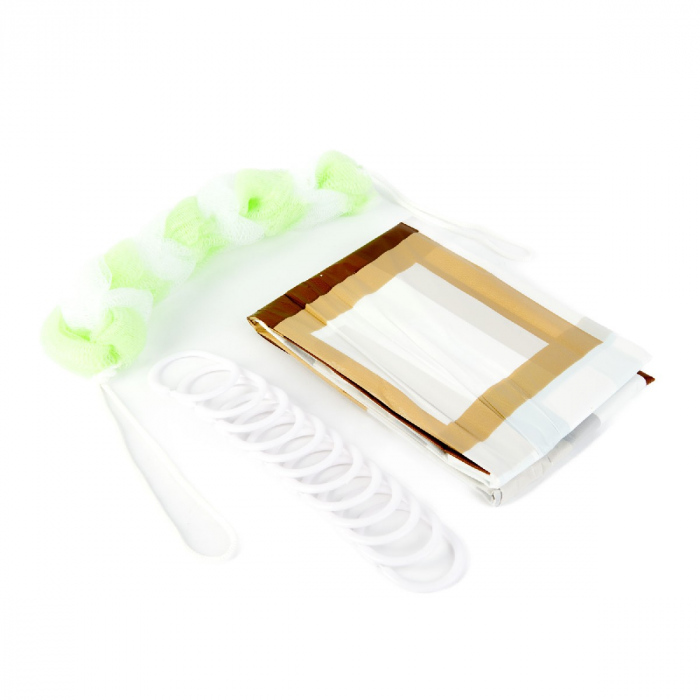 Setul include un burete de baie lung, prevazut cu snururi la ambele capete, ideal pentru spalarea spatelui într-un mod confortabil.