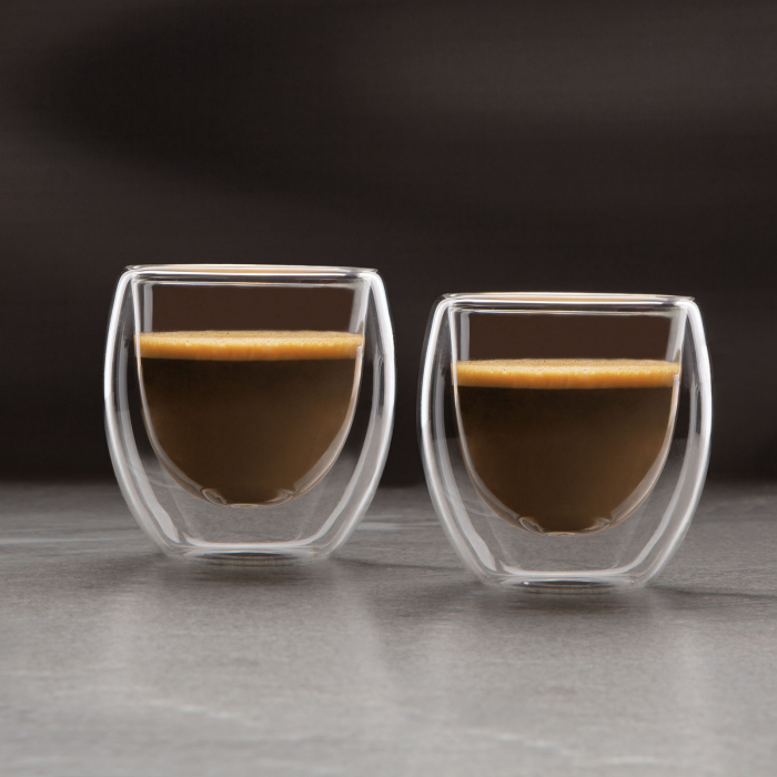 Foloseste acest set de pahare duble din sticla cu aspect modern, realizat din sticla borosilicata pentru a te bucura de cea mai buna cafea. Ideal pentru a bea cafea, bauturi calde si reci. Datorita peretilor dubli de sticla, bautura fierbinte nu va arde mâinile.