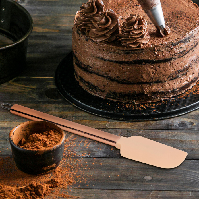 Un accesoriu de baza pentru bucatariile bine echipate este spatula din silicon, pe care o poti folosi pentru a modela si amesteca cu usurinta spume, creme si sosuri. Capul flexibil al spatulei, din silicon termorezistent, previne suprafata vasului fiind deteriorat în timpul gatirii. Spatula are un mâner din otel inoxidabil care ofera un aspect elegant si durabilitate în timpul utilizarii. Mânerul lung este usor de manevrat, confortabil si eficient de utilizat.