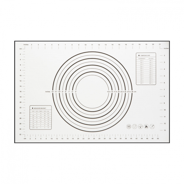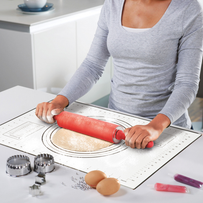 Scara de masurare în cm de pe partea laterala si sabloanele circulare din mijloc te vor ajuta sa întinzi aluatul la dimensiunea perfecta.