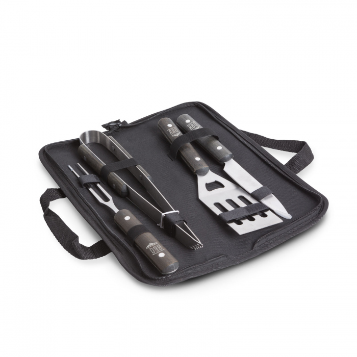 Acest set de gratar este un accesoriu esential pentru gratarele de vara. Potrivit pentru rotirea si servirea carnii si legumelor. Datorita capetelor groase de otel de înalta calitate, carnea la gratar va fi usor de manevrat. Setul include toate uneltele de care ai putea avea nevoie in timpul gratarului. Geanta pentru accesorii ofera portabilitate usoara si depozitare fara deteriorare. Mâner din lemn de calitate Cap gros din otel inoxidabil Penseta, furculita, lopata, cutitul Spargator de bere încorporat Husa de transport cu fermoar inclusa Cu maner Setul include: penseta, furculita pentru carne, lopata Material: otel inoxidabil (2CR14) / lemn Dimensiune totala: 370 x 30 x 60 mm Dimensiune lopata: 105 x 70 mm Distanta de deschidere a pensetei: max. 140 mm Dimensiunea acului pentru carne: 110 x 18 mm Lungimea lamei cutitului: 140 mm Grosimea otelului: 1,5 mm Greutate totala: ~ 562 g