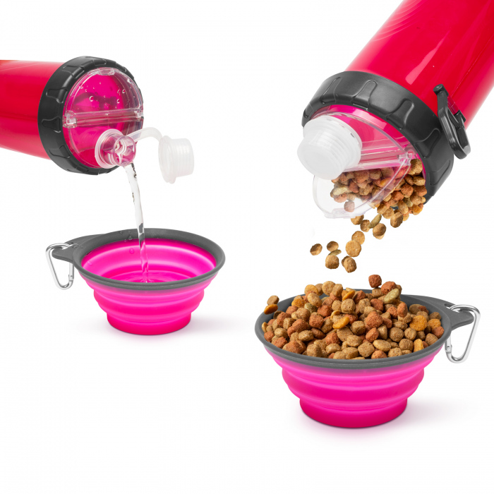 Setul include un recipient cu doua compartimente, care permite proprietarului sa-si potoleasca setea, dar poate fi folosit si pentru depozitarea alimentelor uscate!
