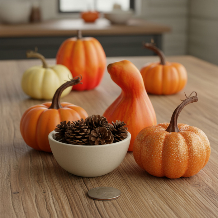 Creeaza un decor de toamna cald si primitor cu acesti dovleci decorativi disponibili în 6 modele diferite. Realizati din plastic si polistiren, acestia impresioneaza prin detaliile realiste si varietatea de culori – portocaliu, rosu si alb. Pot fi utilizati ca piese de sine statatoare pe masa, integrati în coronite sau combinati în aranjamente creative. Suprafata poate fi mata sau cu efect stralucitor, adaugând un plus de diversitate si eleganta. Usori si rezistenti, îsi pastreaza frumusetea ani la rând.