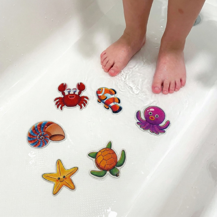 Cel mai vesel si eficient mod de a face cada/dusul sigur pentru copii si întreaga familie! Set de 6 stickere antiderapante cu 6 modele marine diferite (stea de mare, testoasa, caracatita, crab, pestisor clown, scoica) în culori vii (rosu, mov, galben, verde, maro). Se lipesc instant pe suprafete netede, adera perfect chiar si în apa/sapun, nu se dezlipesc si nu lasa urme. Material EVA + PE flexibil si durabil – protectie maxima împotriva alunecarii + decor adorabil pentru baie!