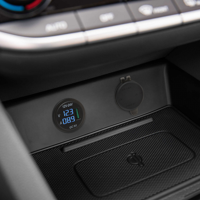 Adaptor USB cu montare în locul brichetei cu voltmetru si ampermetru. Cu acest aparat nu mai aveti nevoie de adaptor cu conectare în bricheta - acesta fiind cu montare fixa, se evita eventualele probleme de contact. Afisajul LED camuflat, de culoare albastra, indica tensiunea si curentul momentan. Capacul de cauciuc împiedica patrunderea impuritatilor în priza USB. Acest capac poate fi înlaturat dupa dorinta.