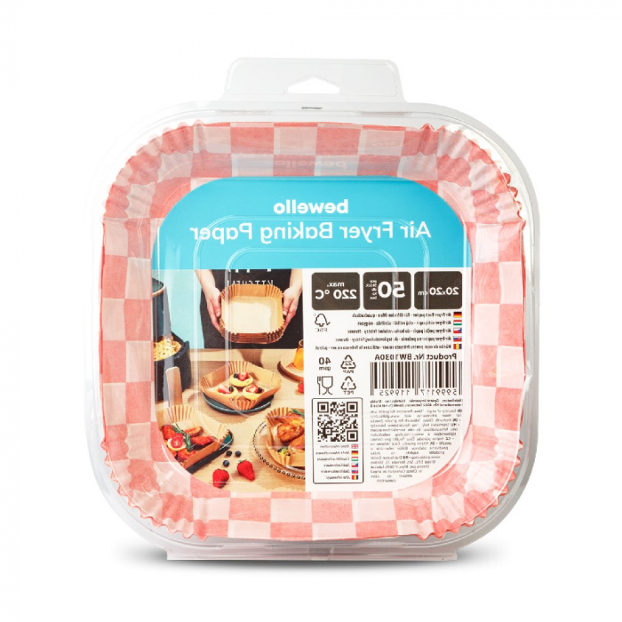 Aceasta hârtie de coacere special conceputa pentru air fryer, cu dimensiunile de 20 x 20 cm, forma patrata si model în carouri, ofera o solutie practica pentru gatit. Fabricata din hârtie de 40 gsm, rezistenta la temperaturi de pâna la 220°C, previne lipirea si arderea alimentelor de cosul de gatit, pastrând gustul intact si reducând pierderile de mâncare. Este ideala pentru utilizare în air fryer, cuptor electric, microunde sau aparate de gatit cu aburi, fiind de unica folosinta si livrata în pachete de 50 de bucati. De asemenea, faciliteaza curatarea cosului, prelungindu-i durata de viata.
