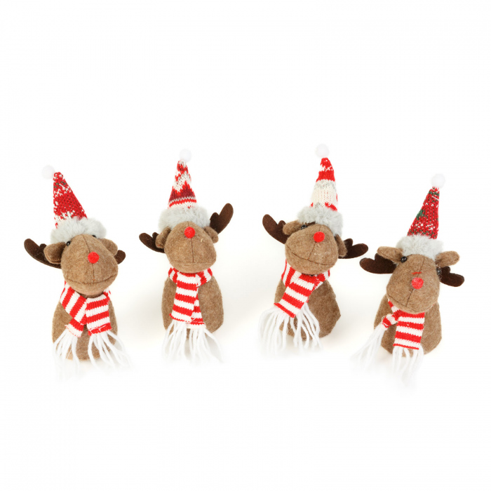 Acesti reni adorabili de 18 cm îmbracati în stil manó skandinav sunt cele mai dragalase accente de Craciun! Cu caciulite rosii-albe-gri, urechi mari si fete vesele, sunt realizati din material textil ultra-moale (poliester + bumbac) si umpluti cu nisip pentru stabilitate. Disponibili în 4 modele diferite – perfecte pe birou, raft, masa sau lânga brad, aduc bucurie si caldura nordica în orice casa.