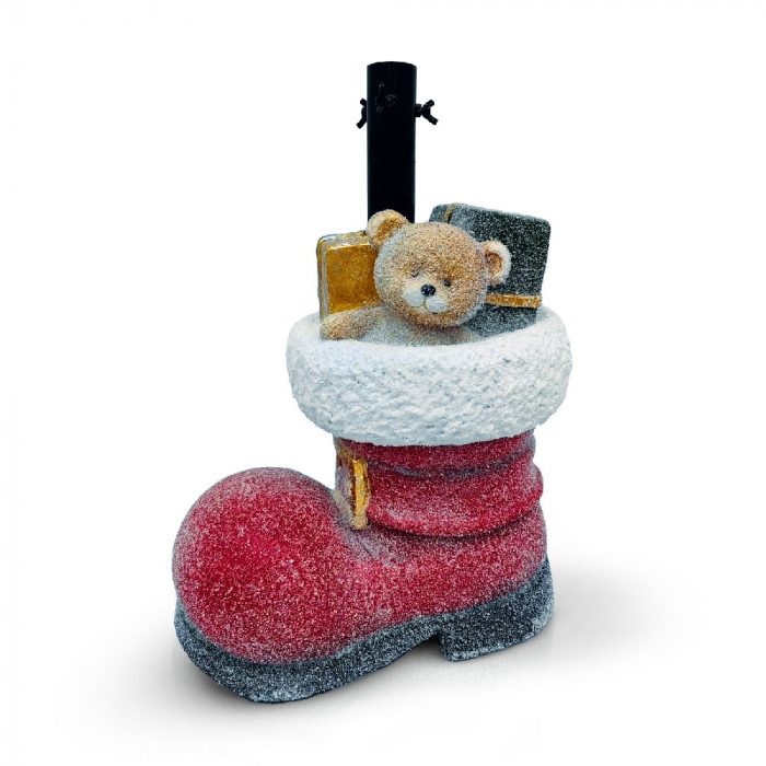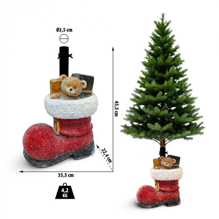 Acest suport de brad în forma de cizma de Mos Craciun nu este doar practic, ci si un element decorativ impresionant pentru pomul de Craciun. Culoarea rosie cu partea superioara alba creeaza o impresie realista de încaltaminte, asigurând în acelasi timp stabilitate pentru pom. Fabricat din piatra artificiala, ofera o prindere solida chiar si pentru brazi de dimensiuni mari.