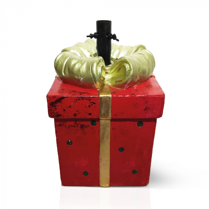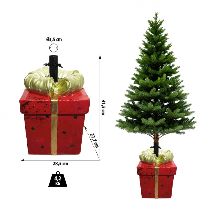 Acest suport de brad în forma de pachet cadou nu este doar practic, ci si un element decorativ impresionant pentru pomul de Craciun. Culoarea rosie cu funda aurie creeaza o impresie realista de cadou, asigurând în acelasi timp stabilitate pentru pom. Fabricat din piatra artificiala, ofera o prindere solida chiar si pentru brazi de dimensiuni mari.