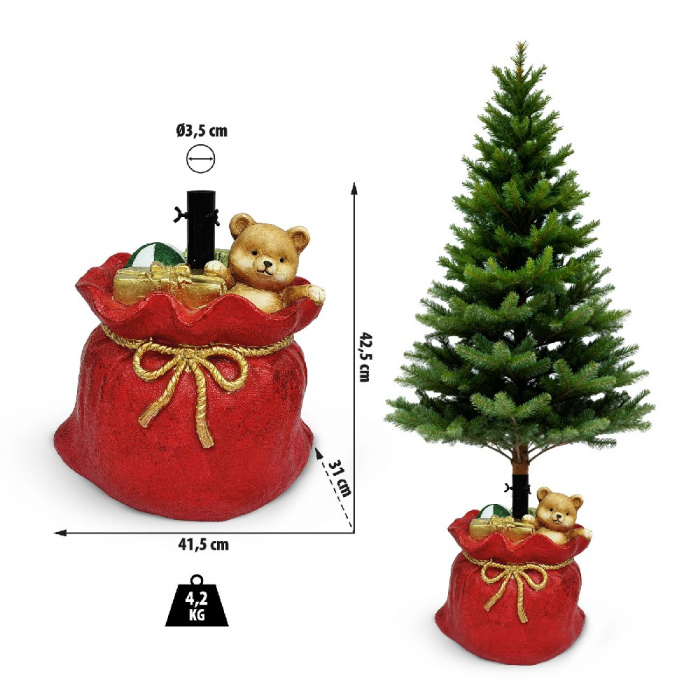 Acest suport de brad în forma de sac de Mos Craciun nu este doar practic, ci si un element decorativ impresionant pentru pomul de Craciun. Culoarea rosie cu snur auriu creeaza o impresie realista de sac plin cu cadouri, asigurând în acelasi timp stabilitate pentru pom. Fabricat din piatra artificiala, ofera o prindere solida chiar si pentru brazi de dimensiuni mari.
