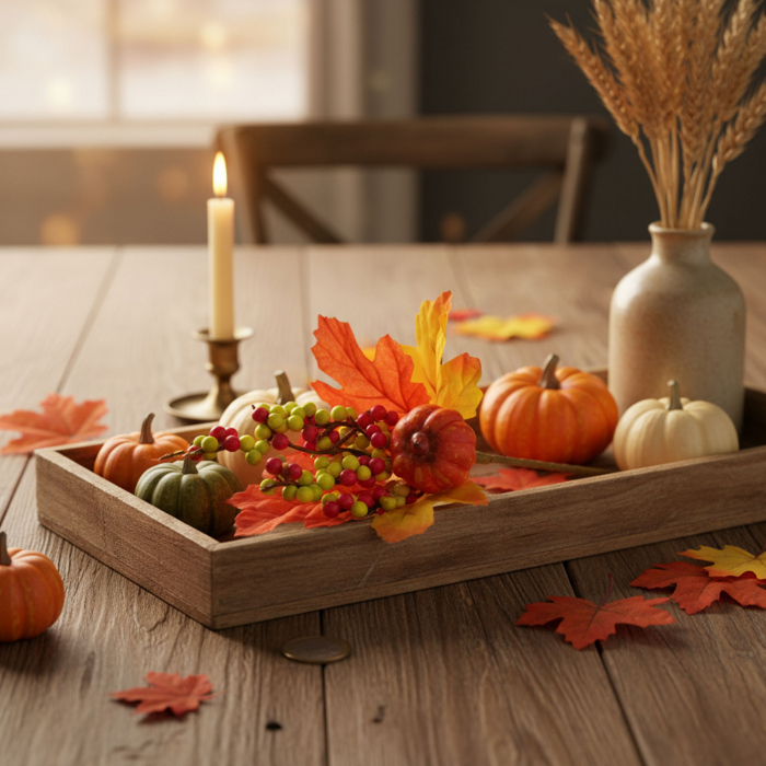 Înveseleste-ti locuinta cu acest set decorativ de toamna ce combina elemente naturale precum dovleac, frunze si bobite colorate. Setul contine doua piese detaliat realizate, în culori vii, care aduc prospetime si caldura oricarui aranjament sezonier. Sunt ideale pentru completarea coronitelor, aranjamentelor de masa sau pentru orice decor de interior inspirat din frumusetea toamnei. Datorita tijei de fixare, aceste decoratiuni se pot integra cu usurinta în diverse compozitii.