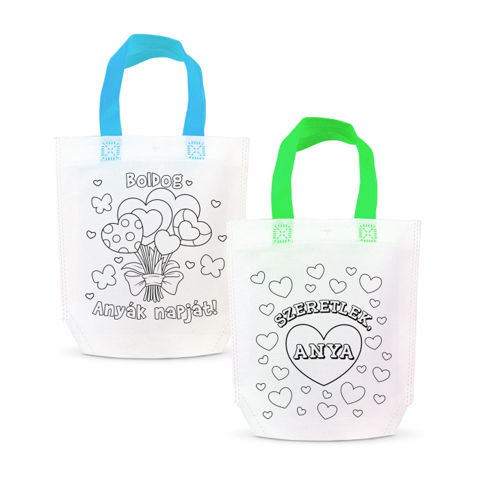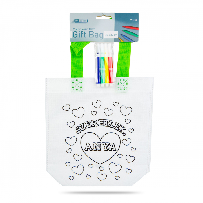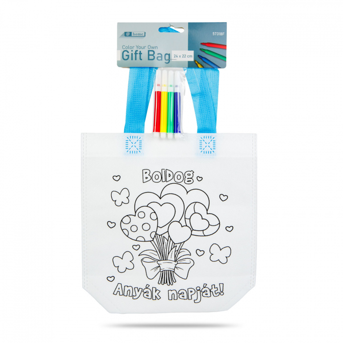 Aceasta geanta cadou colorabila, cu dimensiunile de 24 x 22 cm, este perfecta pentru copii si include 4 markere colorate. Fabricata din material PET (netesut), ofera 2 modele diferite, fiind o combinatie între o geanta practica si o activitate creativa. Pentru colorare, se recomanda introducerea unui carton gros între cele doua straturi ale gentii pentru a preveni scurgerea culorilor. Ideala ca decor sau cadou, inclusiv pentru ocazii precum Ziua Mamei.