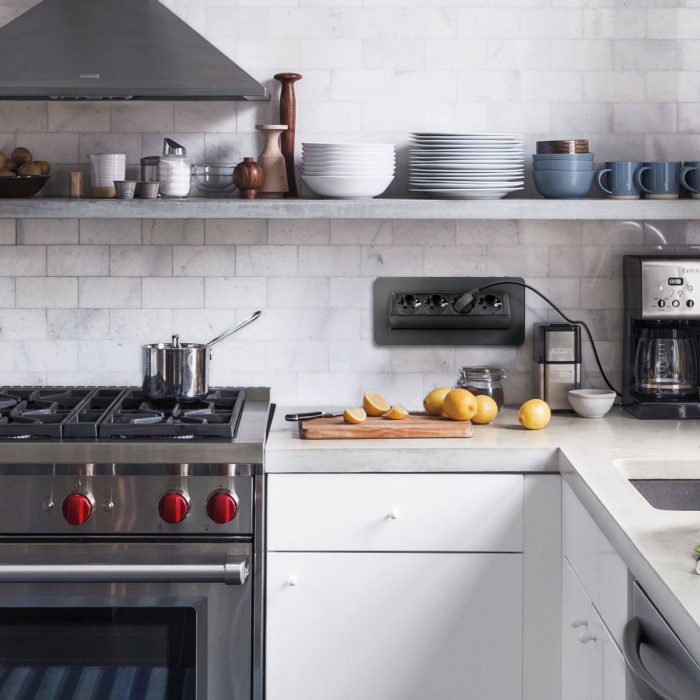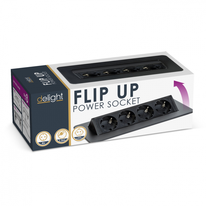 Dispune de 4 prize cu protectie pentru copii si de un mecanism rabatabil tip „flip-up”, care permite deschiderea si închiderea usoara atunci când este nevoie de alimentare. Când nu este utilizat, prelungitorul se integreaza perfect în suprafata blatului, mentinând un aspect ordonat si elegant.