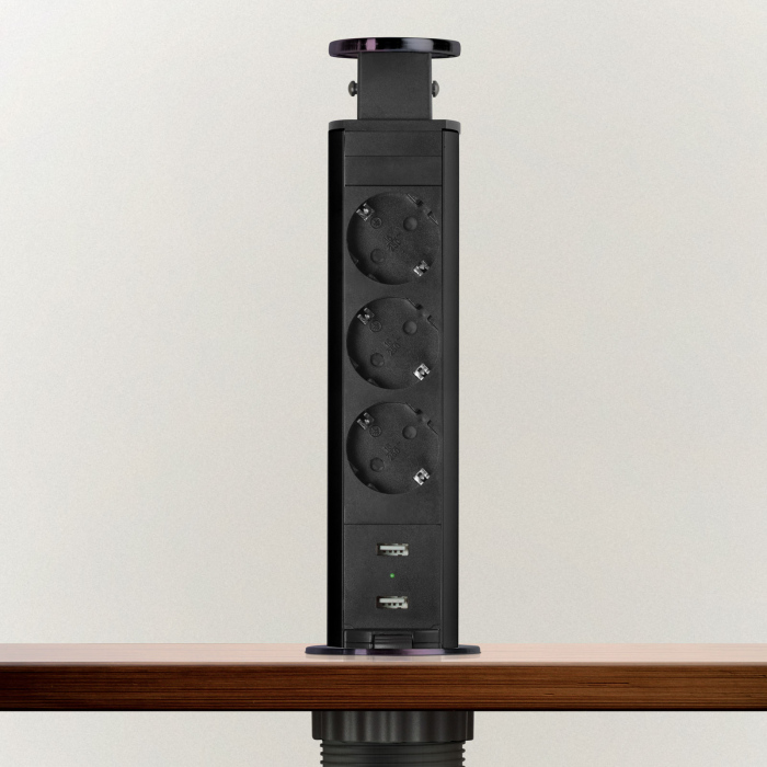 Distribuitor pop-up cu carcasa metalica, 3 prize de protectie pentru copii si doua prize USB, pentru birouri si case.