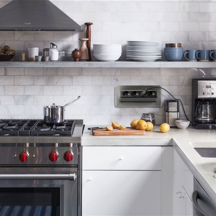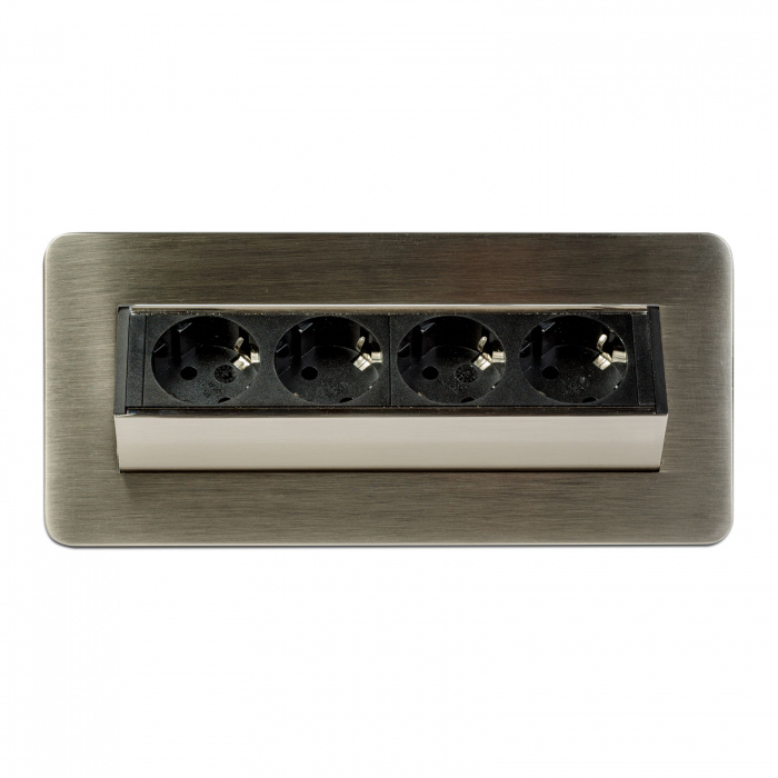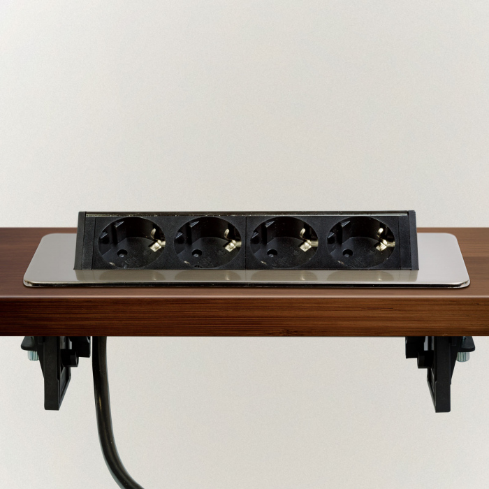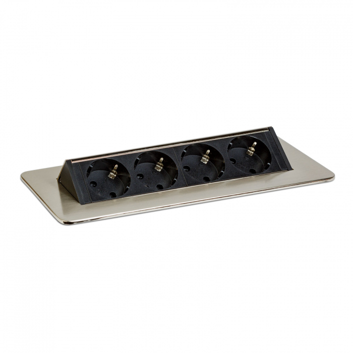 Dispune de 4 prize dotate cu protectie pentru copii, într-un corp rezistent realizat din metal si plastic de calitate. Sistemul de deschidere „flip-up” cu arc permite acces rapid la prize printr-o simpla apasare, iar închiderea completa confera un aspect ordonat si minimalist suprafetei de lucru.