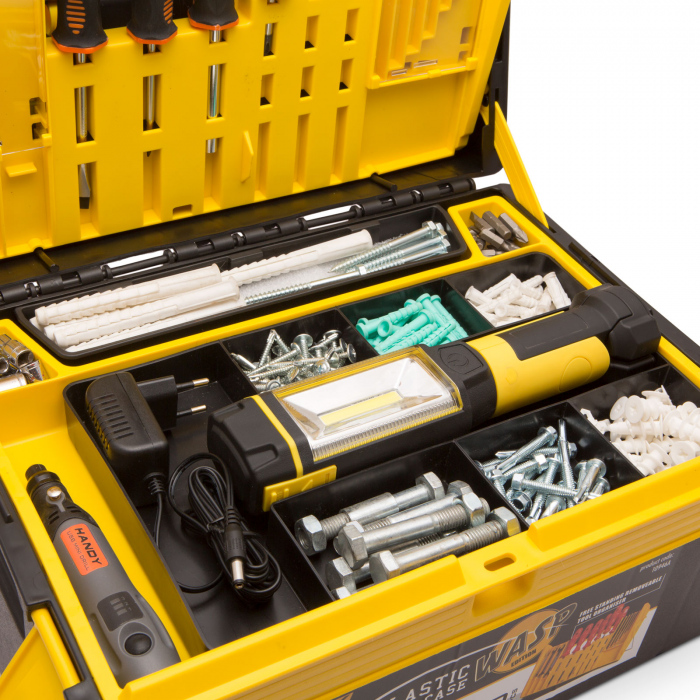 Cu tava organizator amovibila, ideala pentru pastrarea suruburilor, diblurilor, burghielor, surubelnitelor, etc.. Poate fi utilizata si independent;