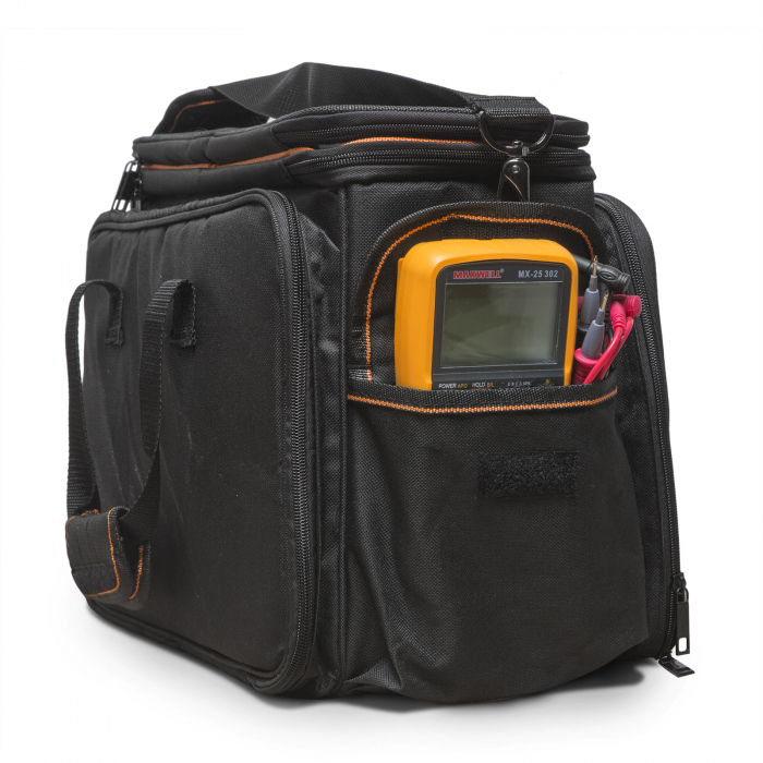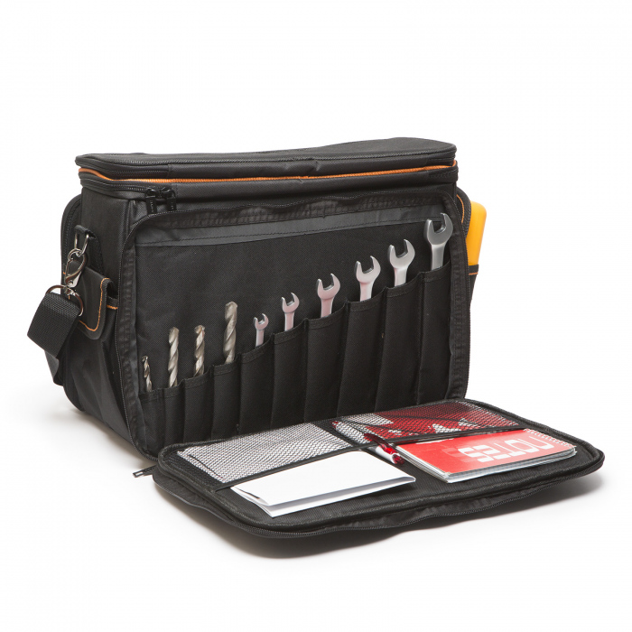 O geanta cu adevarat utila trebuie sa poata satisface nevoile celui ce o foloseste. Ca noutate, am introdus pe piata aceasta geanta ce se remarca prin multiplele sale utilitati, fiind potrivita pentru scule, aparatura foto si chiar ca geanta de calatorii. Laturile longitudinale pot fi detasate cu fermoare. Pe laturile scurte se afla buzunare adânci, detasabile prin scai. Se poate purta în mâna sau pe umar.