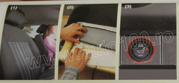 4 elemente de incalzire, set preasamblat de cabluri cu relee de protectie si 2 intrerupatoare universale (pentru ambele scaune) din fata, materiale de fixare ,instructiuni de montaj.