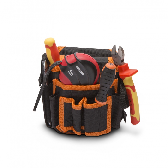 Geantă port-scule deosebit de practică, din polistiren rezistent, cu buzunare multiple în interior şi exterior.