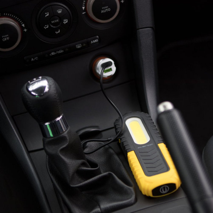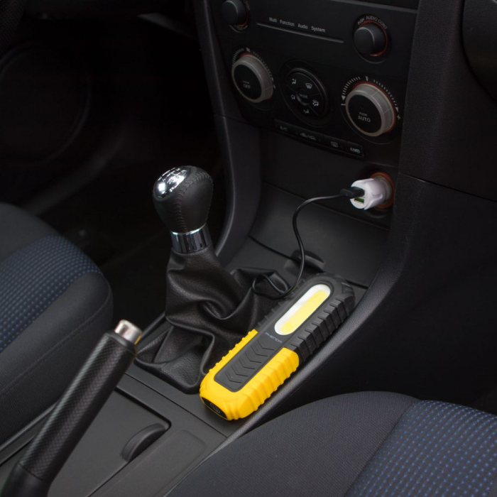Lumina de lucru de mare putere. Nu trebuie sa va lipseasca garaj sau atelier. Tehnologia COB LED lumineaza zona de lucru dorita, datorita suportului sau practic de 360°, suportului si prinderii magnetice, este usor de amplasat asa cum aveti nevoie de o sursa de lumina. Îl poti lua oriunde vrei cu tine, datorita greutatii sale usoare si clemei pentru curea. Capacul din plastic SoftTouch ofera o prindere stabila si anti-alunecare. Lampa doua într-o singura, deasupra cu lanterna LED, în fata cu lampa de lucru COB LED. Bateria sa Li-ion încorporata îl face un dispozitiv ecologic, cu o durata de viata lunga a bateriei.