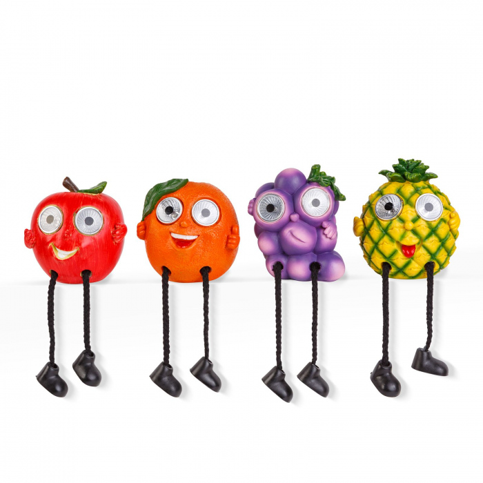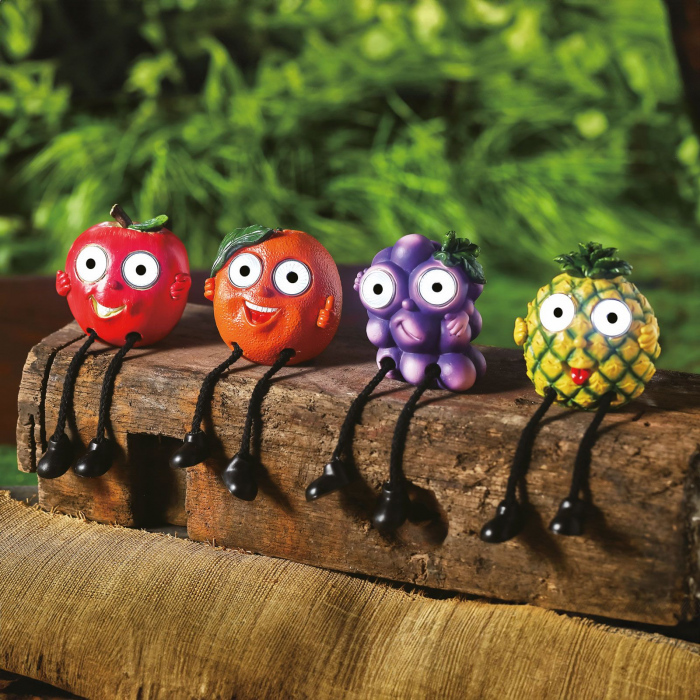 Lumineaza-ti gradina sau terasa cu aceste fructe solare vesele! Alegeti dintre patru forme distractive diferite, cum ar fi portocale, struguri, mere sau ananas, fiecare cu un ochi stralucitor. LED-urile alb rece încorporate se aprind automat la amurg si lumineaza împrejurimile lor cu luminozitate ridicata. Nu este necesara nicio sursa de alimentare externa sau înlocuirea bateriei, panoul solar încarca bateria cu energie solara. Alegerea perfecta daca vrei sa pui zâmbetul pe fetele invitatilor tai sau daca vrei o gradina cu adevarat speciala!