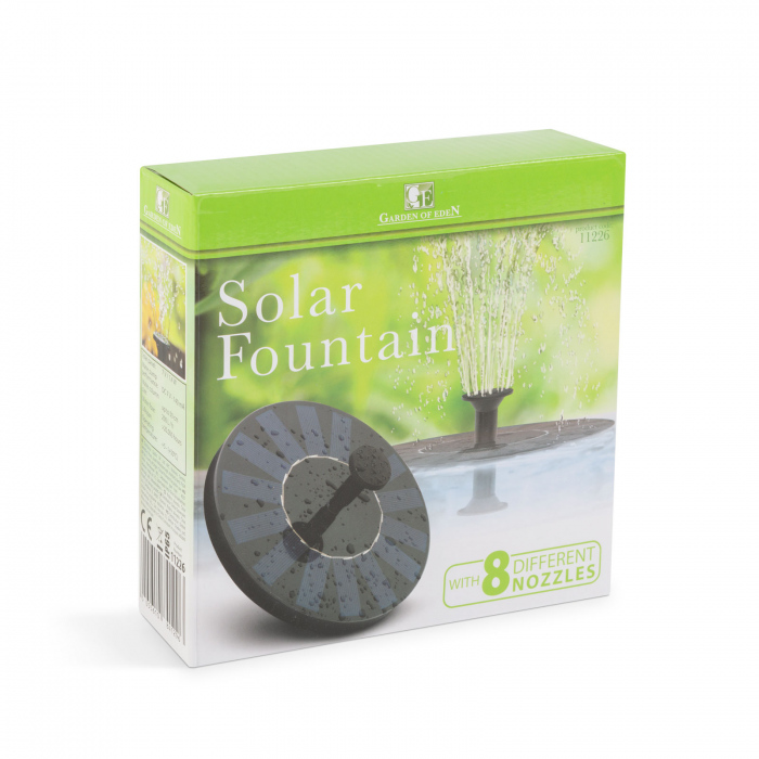 Creeaza atmosfera placuta în gradina ta cu aceasta fântâna arteziana care poate fi plasata chiar în lacurile de gradina. Fântâna este alimentata solar, datorita panourilor solare încorporate. Nu este necesara cablarea, alimentarea de la retea sau înlocuirea bateriei. Dispozitivul poate fi utilizat cu 5 tipuri de duze diferite, astfel încât oricine îsi va gasi varianta cea mai estetica si potrivita pentru gustul propriu. Utilizarea produsului este cât se poate de simpla: Aseaza duza corespunzatoare pe dispozitiv si amplaseaza produsul pe suprafata apei. Pompa din partea inferioara a dispozitivului ejecteaza apa prin duza. Înaltimea jetului de apa depinde în mare masura de intensitatea razelor solare si de cantitatea de lumina solara directa incidenta pe panoul solar.