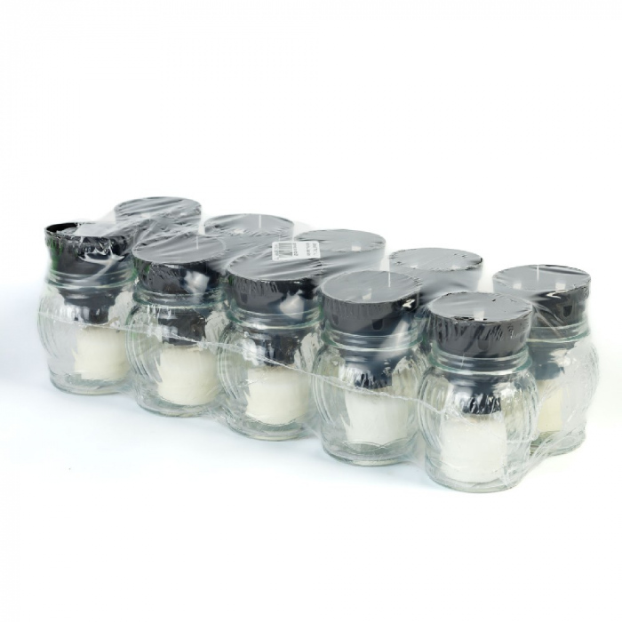 Aceasta lumânare clasica din sticla alba este o alegere potrivita pentru comemorari, sarbatori sau vizite la cimitir. Recipientul din sticla transparenta cu aspect alb ofera o nota eleganta si sobrua, iar capacul negru din plastic protejeaza flacara si îi prelungeste arderea.
