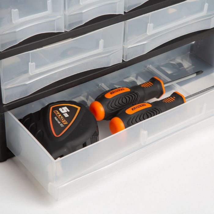Puteti lucra eficient numai in conditii ordonate! Cu ajutorul acestui organizator portabil, puteti pastra separate pe marimi si tip piese mici, suruburi, dibluri, cuie, intrerupatoare sau alte componente electronice necesare pentru lucrari. Datorita elementelor de divizare, puteti separa pana la 24 de tipuri de accesorii. Sertarele transparente si detasabile ofera o vizibilitate buna.