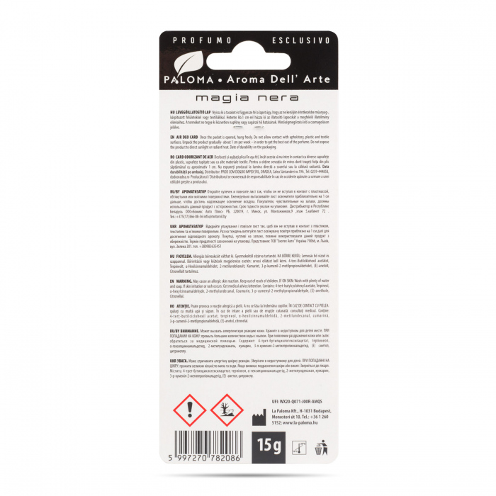 Familia de odorizante Paloma Aroma Del 'Arte adauga eleganta si sofisticare pentru a face fiecare calatorie speciala! Designul modern si paleta de culori minimalista ofera masinii dvs. un aspect rafinat si elegant. Odorizantul umple interiorul vehiculului dumneavoastra cu un miros placut, proaspat, care aduce un sentiment de prospetime si curatenie. O alegere ideala pentru cei carora le pasa nu numai mirosul, ci si armonia interiorului masinii lor.