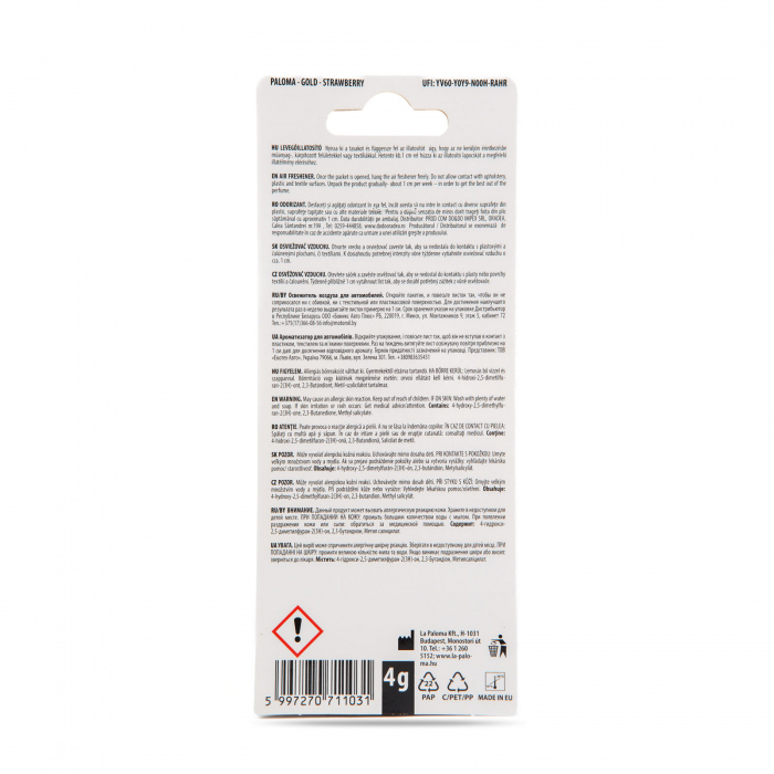 O experienta de parfum racoritoare din mers! Odorizantul pentru masina Paloma Gold Fresh Fruit este un produs de înalta calitate, agatat, care va face calatoriile mai placute, cu parfumul sau fructat de lunga durata. Aromele atent selectate creeaza o atmosfera racoritoare si armonioasa în vehiculul dumneavoastra sau chiar în casa dumneavoastra.
