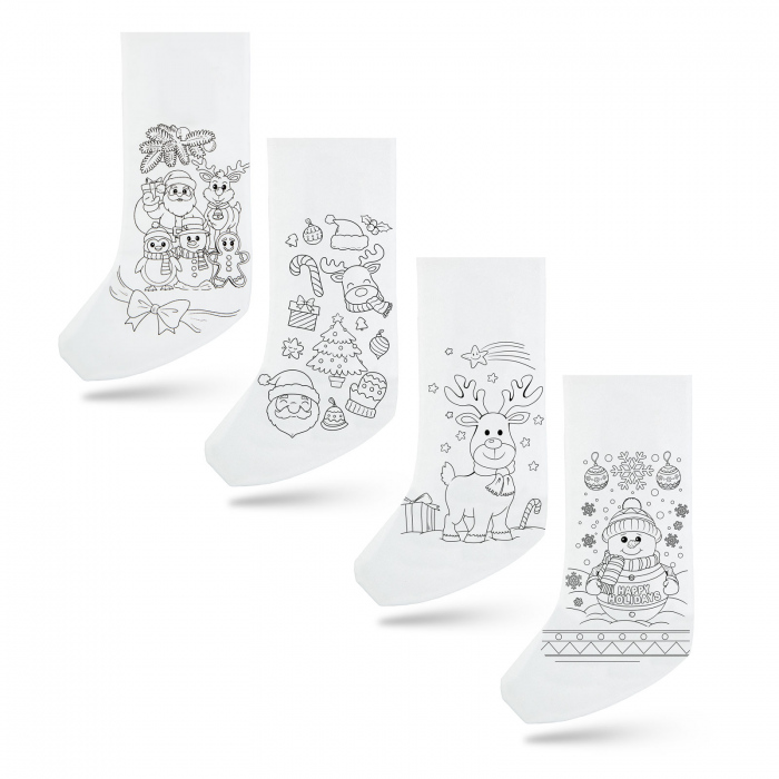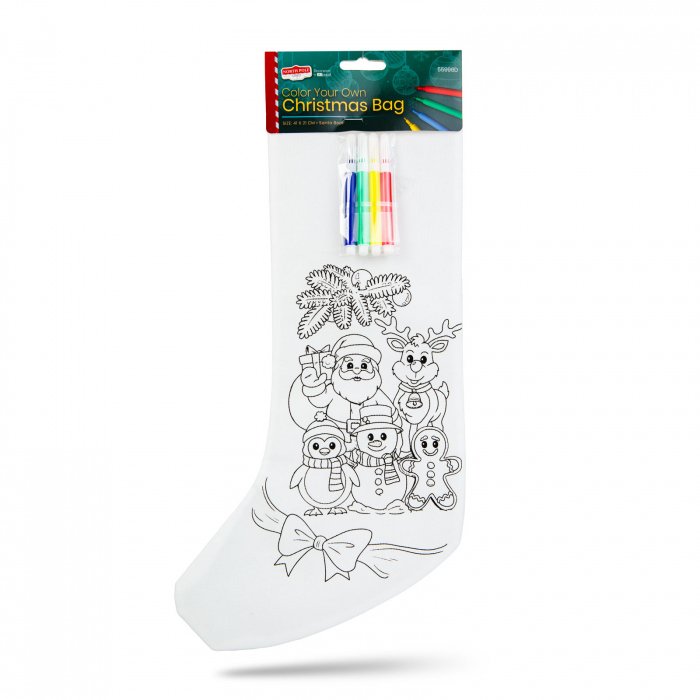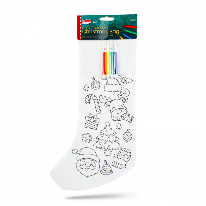 Aceasta cizma de Mos Craciun colorabila, cu dimensiunile de 41 x 21 cm, este ideala pentru copii si include 4 markere colorate. Fabricata din material textil PET (netesut), ofera 4 modele festive, combinând rolul decorativ de cizma de Craciun cu o activitate creativa. Pentru colorare, se recomanda introducerea unui carton gros între cele doua straturi ale gentii pentru a preveni scurgerea culorilor. Perfecta pentru decorarea locuintei în perioada sarbatorilor de iarna.