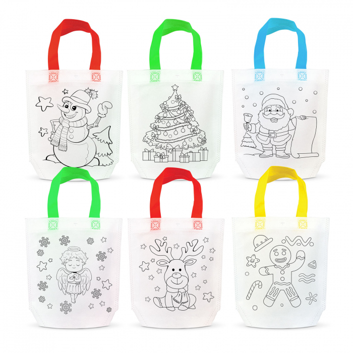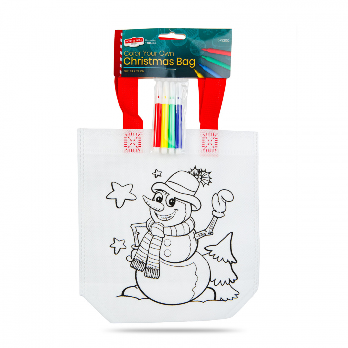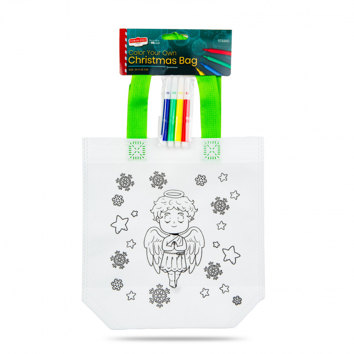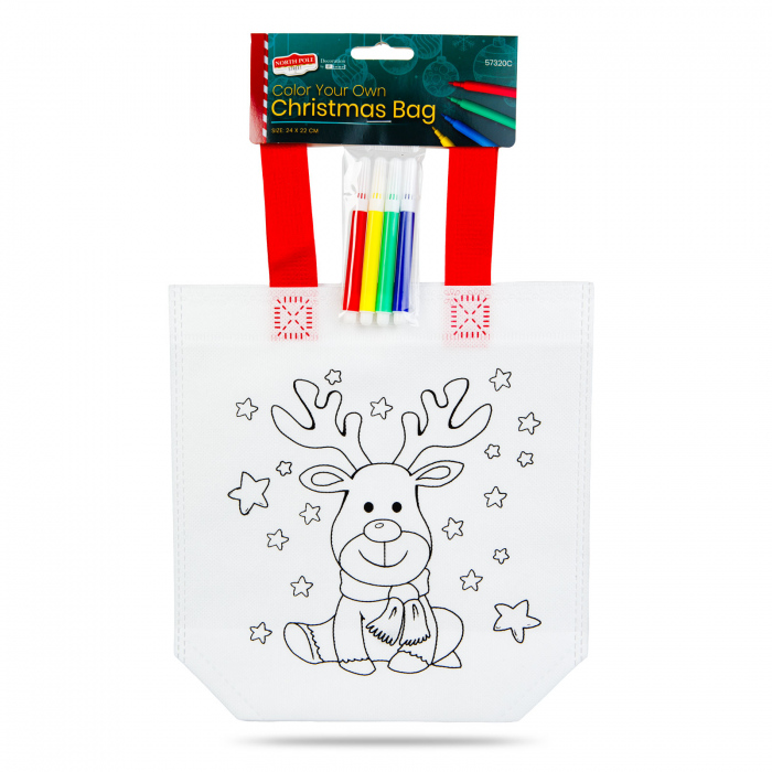 Aceasta geanta colorabila cu tema de Craciun, având dimensiunile de 24 x 22 cm, este conceputa pentru copii si include 4 markere colorate. Realizata din material PET (netesut), ofera 6 modele festive diferite, fiind atât o geanta practica, cât si o activitate creativa. Pentru colorare, se recomanda introducerea unui carton gros între cele doua straturi ale gentii pentru a preveni scurgerea culorilor. Ideala pentru decorarea locuintei în perioada sarbatorilor.