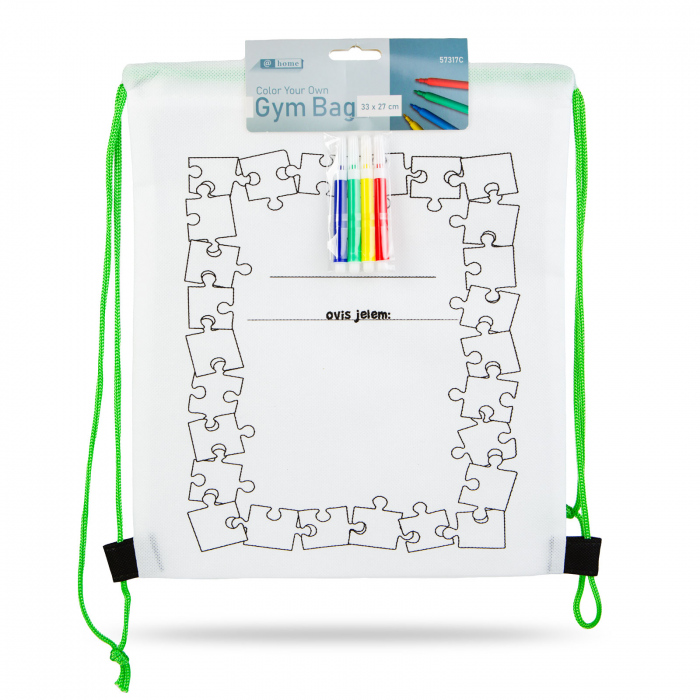 Acest sac de sport colorabil, cu dimensiunile de 33 x 27 cm, este ideal pentru copii si include 4 markere colorate. Fabricat din material PET (netesut), combina functionalitatea unui sac de gimnastica sau rucsac cu o activitate creativa. Pentru colorare, se recomanda introducerea unui carton gros între cele doua straturi ale sacului pentru a preveni scurgerea culorilor. Perfect pentru scoala, decor sau cadouri.