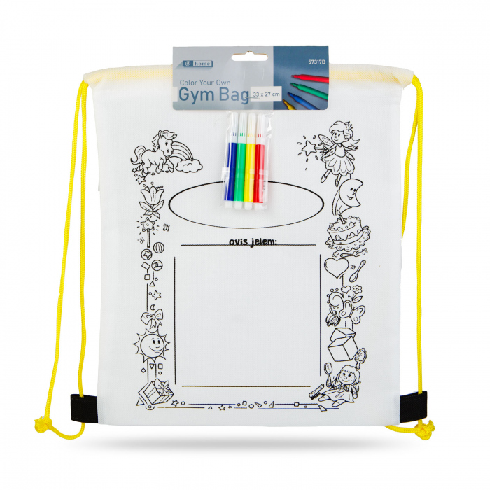Acest sac de sport colorabil, cu dimensiunile de 33 x 27 cm, este ideal pentru copii si include 4 markere colorate. Fabricat din material PET (netesut), combina functionalitatea unui sac de gimnastica sau rucsac cu o activitate creativa. Pentru colorare, se recomanda introducerea unui carton gros între cele doua straturi ale sacului pentru a preveni scurgerea culorilor. Perfect pentru scoala, decor sau cadouri.