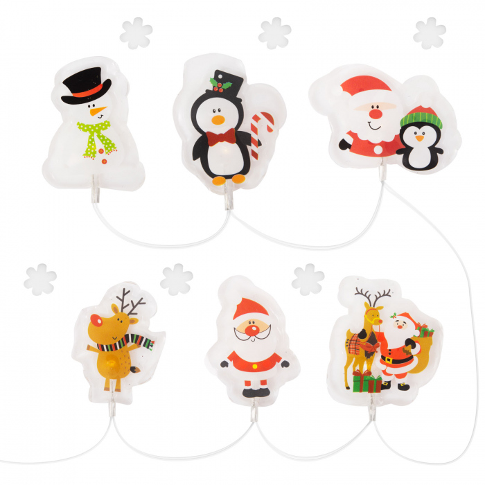 Decoreaza-ti fereastra sau frigiderul cu un sir de lumini pe tema Craciunului. Motivele vesele de Craciun sunt iluminate de lumina alba calda, astfel încât ofera o priveliste magica chiar si pe timp de noapte. Diferitele figuri au o consistenta de gel si se lipesc fara adeziv, putând fi apoi îndepartate fara urma atunci când nu mai ai nevoie de ele. Setul include si 6 fulgi de nea, care pot fi plasati oriunde.
