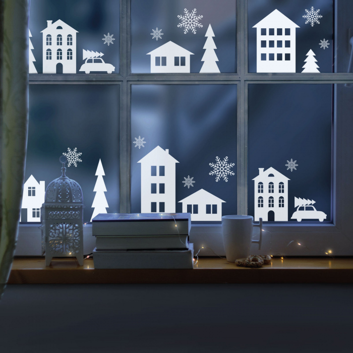 Un decor vesel pentru fereastra de Craciun - va crea o atmosfera de sarbatoare. Poate fi aplicat si îndepartat cu usurinta fara a lasa urme. Unele parti ale autocolantului sunt decorate cu sclipici.