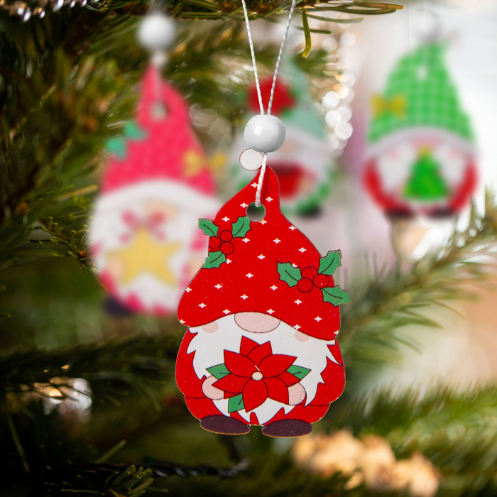 Set de decoratiuni pentru brad din lemn. Creeaza o atmosfera confortabila si împodobeste-ti bradul de Craciun cu ornamente din materiale naturale. Pictate, în total 12, figurine spiridusi scandinavi într-un singur pachet.