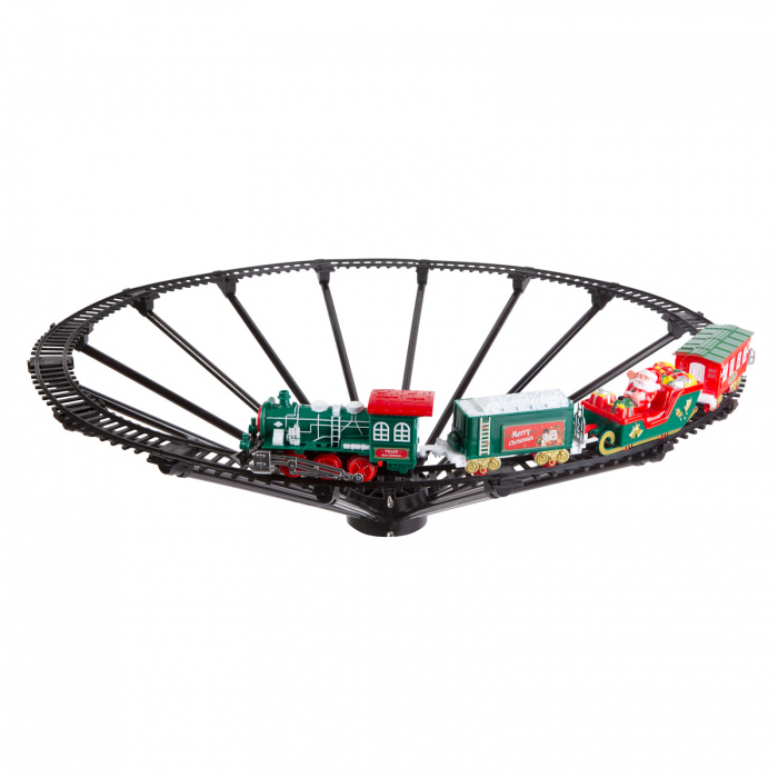 Acest trenulet nu numai ca decoreaza, ci si îmbunatateste atmosfera de sarbatoare cu functiile sale unice. Locomotiva lumineaza, reda muzica si ofera o experienta magica pentru întreaga familie, deoarece dispare printre ramurile braduletului tragând vagoanele si sania lui Mos Craciun. Asamblarea nu necesita experienta, se poate monta in cateva minute. Produsul este fabricat din materiale de înalta calitate, astfel încât are o durata de viata lunga. Trenuletul este alimentat de 2 baterii AA, care trebuie introduse în locomotiva si apoi pornite si oprite cu comutatorul în lateral. Puteti alege ordinea vagoanelor dupa cum doriti.