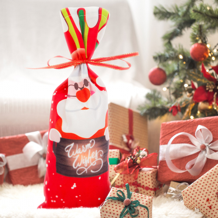 Ofera cadoul de Craciun cu stil si îmbraca-l într-o tinuta pe masura. Introdu sticlele de bautura în punga de poliester si leaga fundita la gâtul sticlei folosind panglica furnizata!