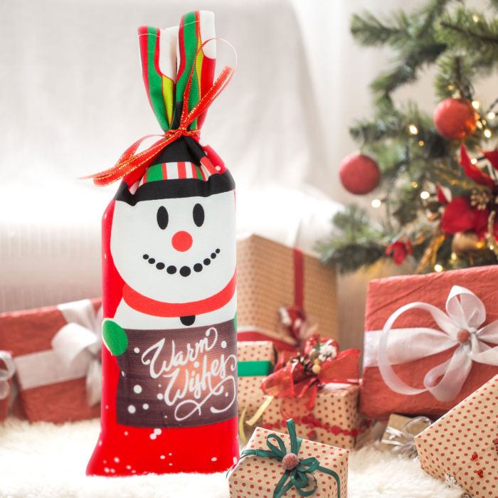 Ofera cadoul de Craciun cu stil si îmbraca-l într-o tinuta pe masura. Introdu sticlele de bautura în punga de poliester si leaga fundita la gâtul sticlei folosind panglica furnizata!
