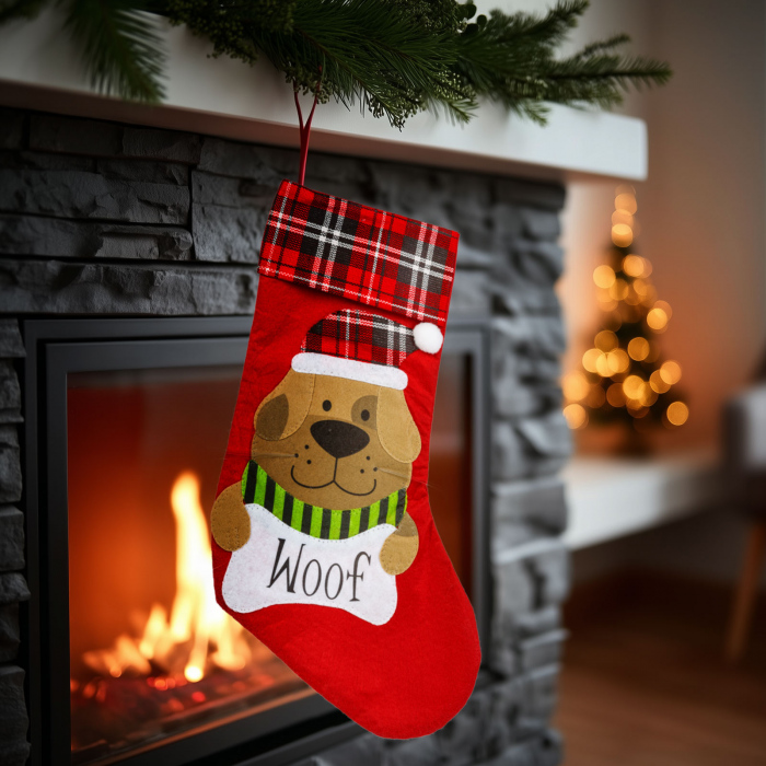 Aceasta soseta decorativa este alegerea ideala pentru iubitorii de animale care doresc sa includa si prietenii lor necuvântatori în atmosfera festiva. Modelul cu câine si inscriptia „Woof” aduce un strop de veselie si originalitate în decorul tau, fiind perfecta pentru a ascunde recompense, jucarii mici sau alte surprize pentru patrupedul tau.