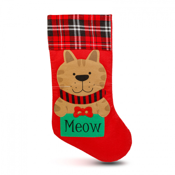 Aceasta soseta decorativa este alegerea perfecta pentru iubitorii de pisici care vor sa aduca un plus de veselie si originalitate decorului lor de sarbatori. Modelul cu pisica si inscriptia „Meow” ofera un detaliu amuzant si plin de personalitate, fiind ideal pentru depozitarea recompenselor, jucariilor sau micilor surprize dedicate pisicii tale.