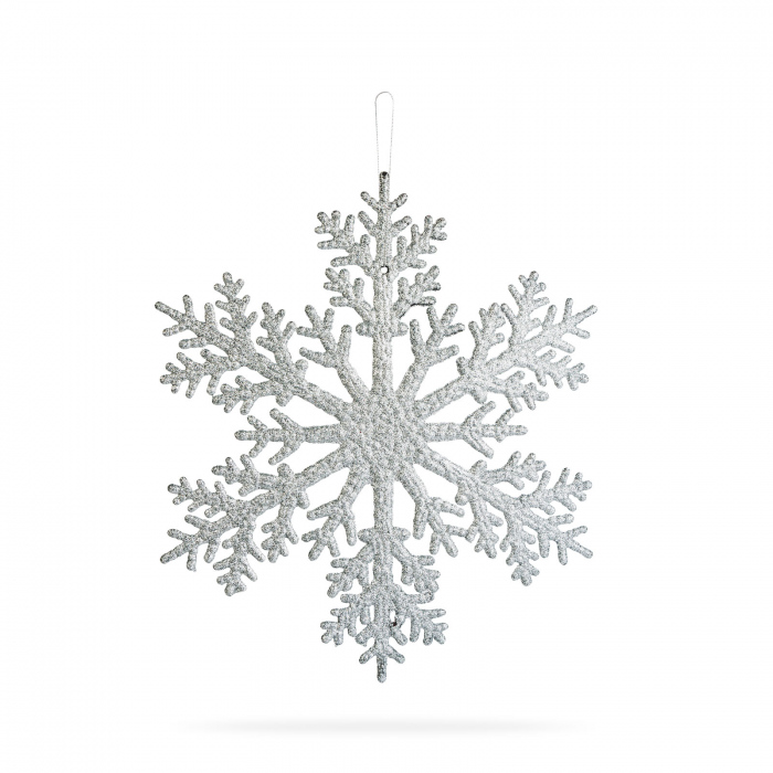 Ofera un plus de rafinament si stralucire decorului tau de iarna cu aceasta decoratiune eleganta în forma de fulg de gheata. Finisajul glitter argintiu reflecta frumos lumina, adaugând un efect spectaculos si festiv oricarui spatiu.