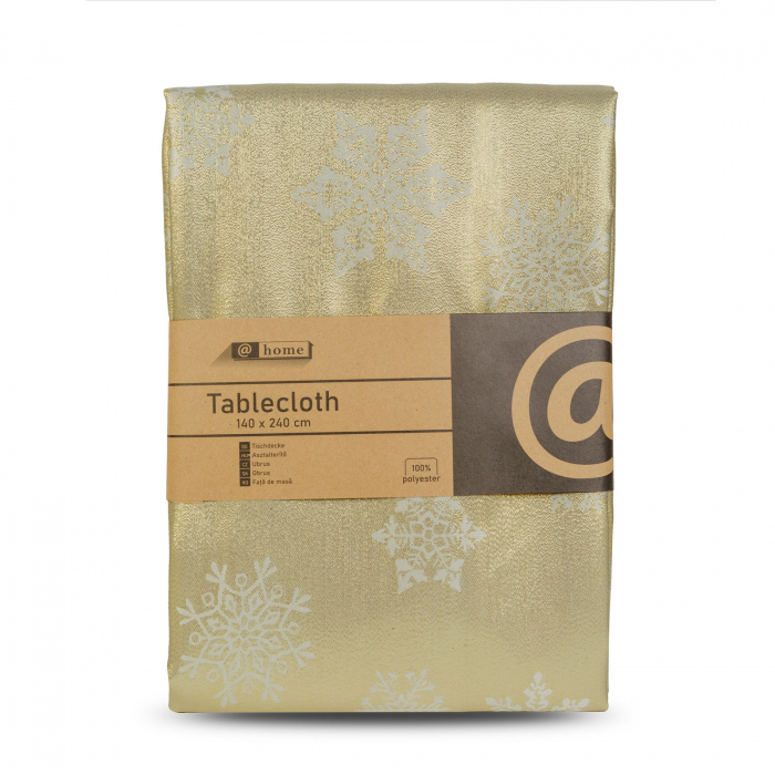 Tesatura 100% poliester ofera un aspect placut, moale la atingere si este usor de întretinut, rezistenta la uzura si pete. Modelul subtil cu fulgi de nea si finisajul auriu adauga un plus de rafinament oricarui decor de sarbatoare.