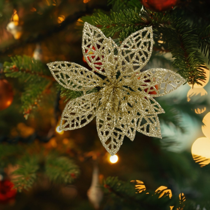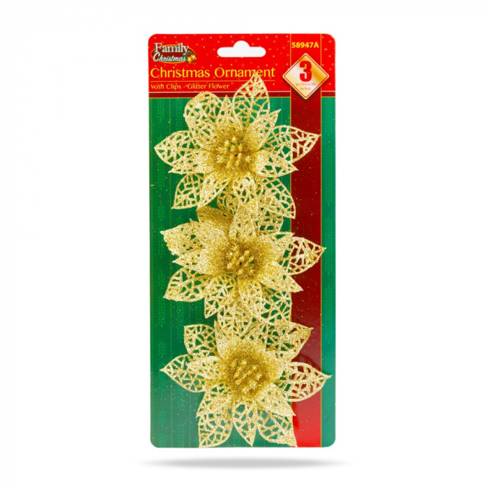Produs special de decoratiuni de Craciun ce poate fi atasat cu cleme. Floarea are o suprafata stralucitoare, stralucitoare. Datorita atasarii sale cu clips, poate fi folosit într-o gama larga de aplicatii, ideal pentru decorarea pomilor de Craciun, ghirlande, ciocanitoare la usa si coroane de Advent.
