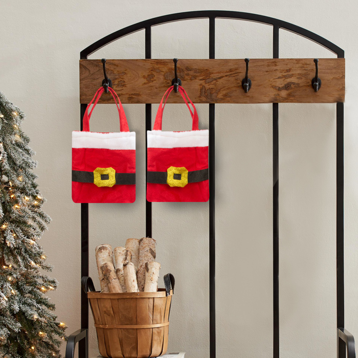 Ofera cadouri cu stil! Geanta cadou din material moale, cu centura de Mos Craciun. Ideal pentru a oferi mici cadouri.